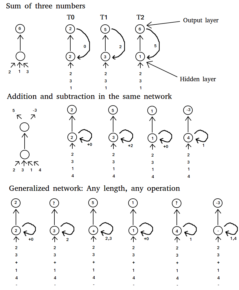 如果我们想要一个常规的神经网络解决两个数字相加的问题,那么我们可以只输入这两个数字并训练网络来预测这些输出的总和。如果我们现在想要三个数字相加而不是两个数字,我们可以(1)使用额外的输入和权重来扩展我们的网络并重新训练它,或者(2)将输出(即前两个数字和第三个数字的总和)反馈到网络中。方法(2)显然更好,因为我们可以希望网络在不重新训练整个网络的情况下表现良好(网络已经“知道”如何将两个数字相加,因此它应该知道如何将两个数字之和与另一个数字相加)。
