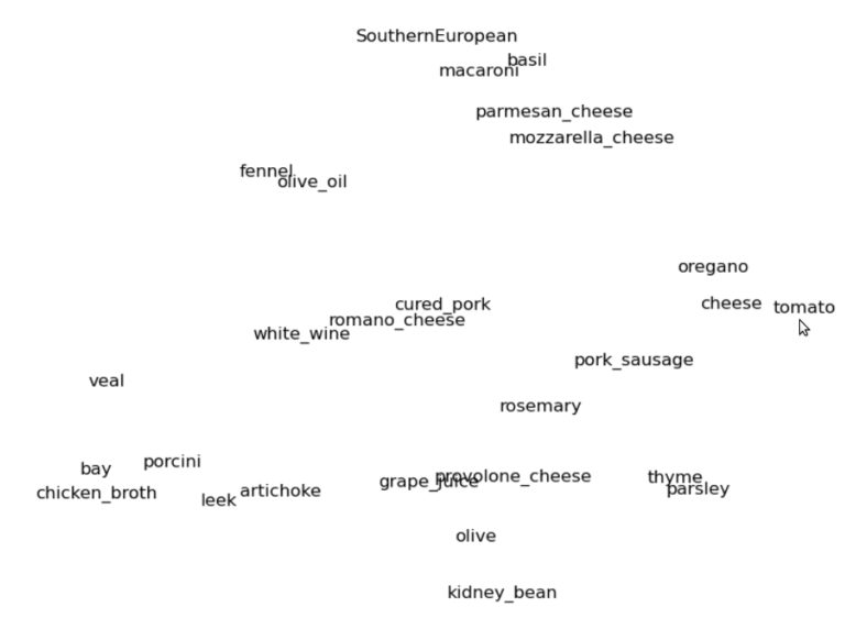 图 3:烹饪食谱的二维词嵌入空间。这里我们放大到“南欧” 集群 。